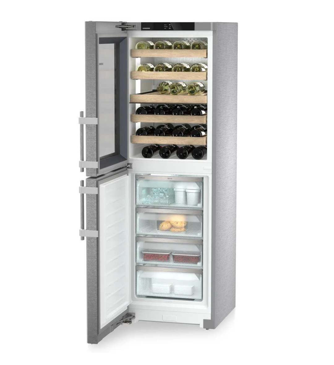 Liebherr SWNstd 529i łączy strefę wina i zamrażarkę NoFrost w eleganckim, stalowym wykończeniu.